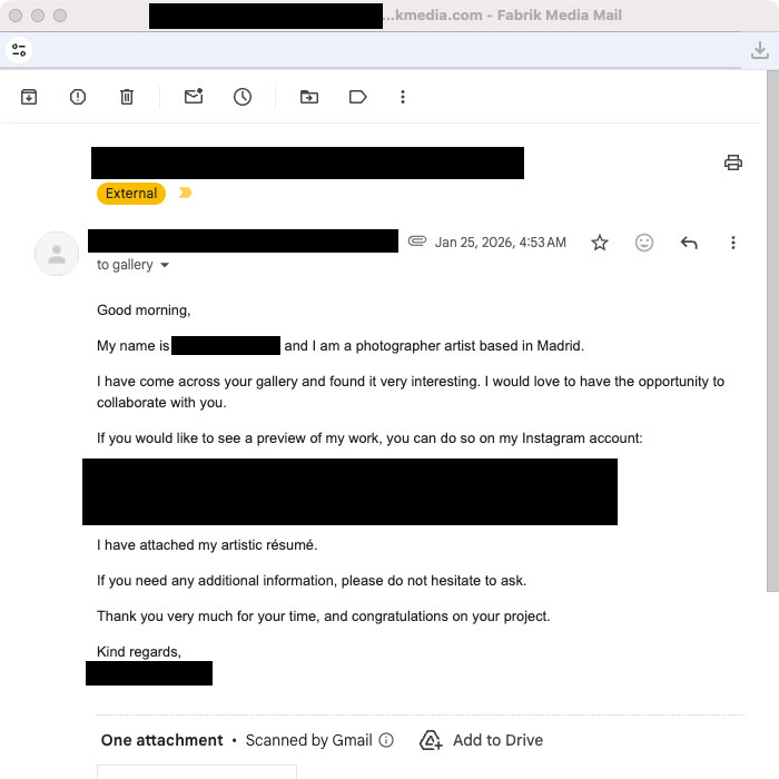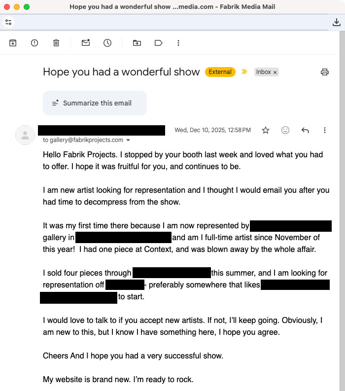 “Hello Fabrik Projects” is already miles ahead of “Dear Gallery” — but “Hi Chris” would have made it feel like a conversation instead of a pitch. That takes about thirty seconds on most gallery websites. It’s a small thing, but small things are the whole game here.