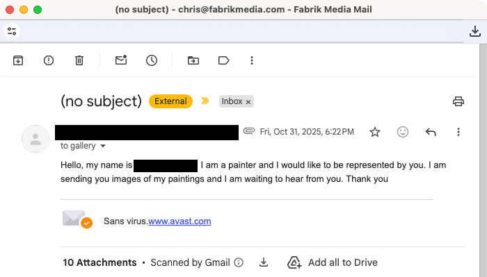 No subject line. Two sentences. Ten unsolicited image attachments. “I am waiting to hear from you” after giving me nothing to respond to. This is the email equivalent of dropping a stack of canvases on someone’s desk and walking out.