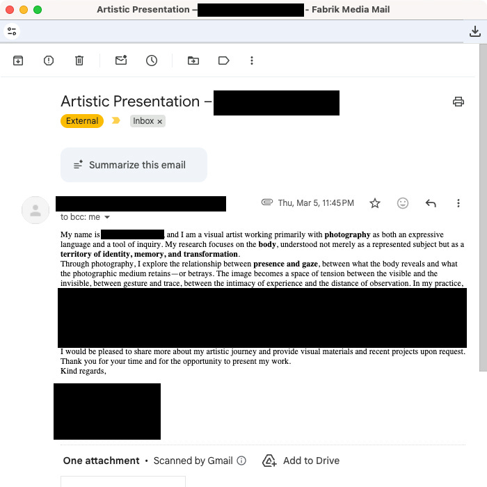 This went on for three more paragraphs. It reads like a graduate thesis abstract, not an email to a human being. Beautiful writing, probably — but I’m a gallerist with forty unread messages, not a panel reviewer. There was no mention of my gallery anywhere in it. Not once. So this artist clearly doesn’t know anythign about the gallery.